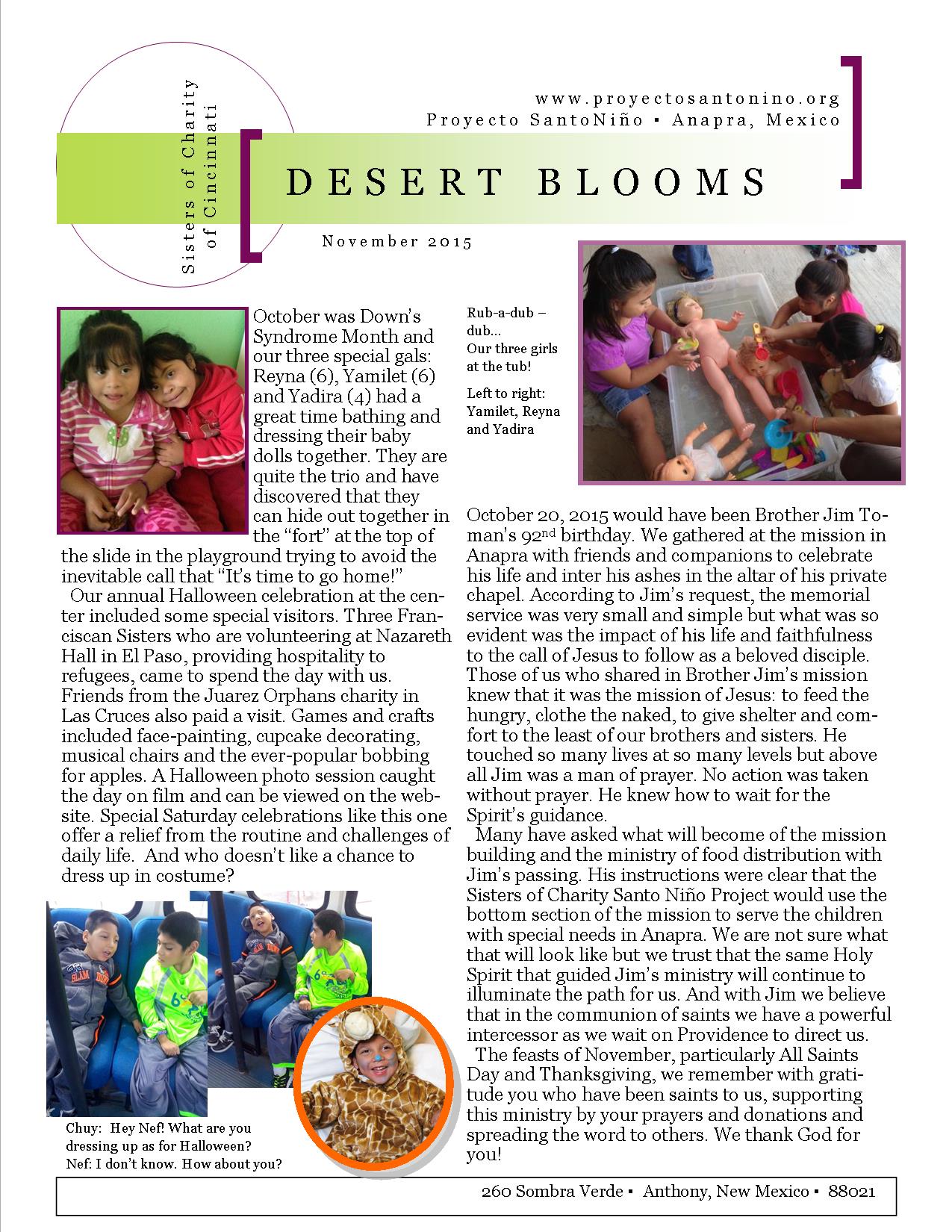 Desert Blooms is a monthly newsletter that the Sisters of Charity mail out to their friends and supporters to keep them up-to-date on what's going on with Proyecto Santo Niño. It also tells little stories about the lives of the children, their families and the grace-filled moments of the people who get involved with the project and how lives are changed forever.